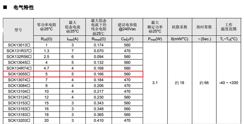 熱敏電阻: VT 熱敏電阻型號(hào): SCK13055MSY 熱敏電阻片徑: Φ13mm 零功率電阻@25℃: 5Ω 工作溫度范圍: -40℃±170℃ 儲(chǔ)存溫度范圍: -40℃±85℃