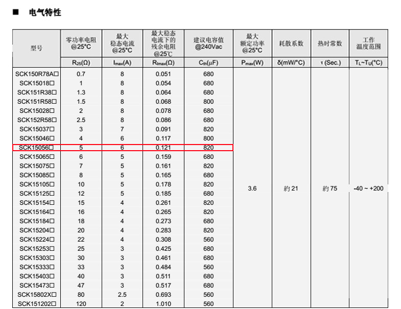 熱敏電阻: VT 熱敏電阻型號(hào): SCK15056MSY 熱敏電阻片徑: Φ15mm 零功率電阻@25℃: 5Ω 工作溫度范圍: -40℃±200℃ 儲(chǔ)存溫度范圍: -40℃±85℃