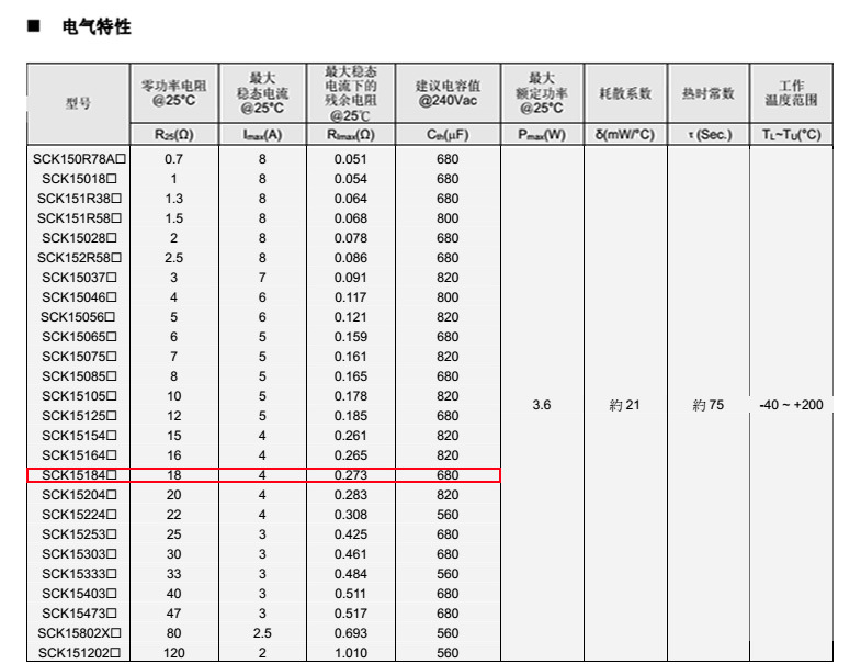熱敏電阻: 穩(wěn)騰 熱敏電阻型號: SCK15184MSY 熱敏電阻片徑: Φ15mm 零功率電阻@25℃: 18Ω 工作溫度范圍: -40℃±200℃ 儲存溫度范圍: -40℃±85℃