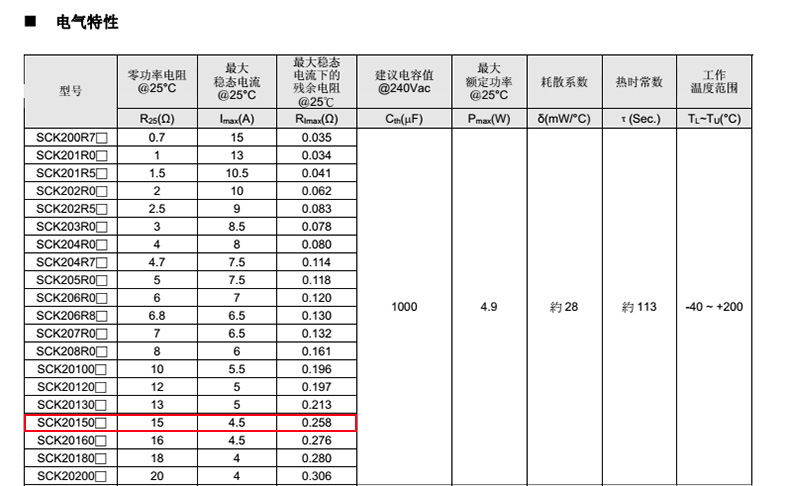 熱敏電阻: 臺灣興勤 熱敏電阻型號: SCK20150MSY 熱敏電阻片徑: Φ20mm 零功率電阻@25℃: 15Ω 工作溫度范圍: -40℃±200℃ 儲存溫度范圍: -40℃±85℃