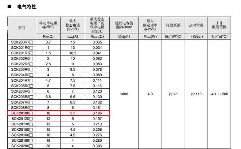 熱敏電阻: VT 熱敏電阻型號(hào): SCK20100MSY 熱敏電阻片徑: Φ20mm 零功率電阻@25℃: 10Ω 工作溫度范圍: -40℃±200℃ 儲(chǔ)存溫度范圍: -40℃±85℃