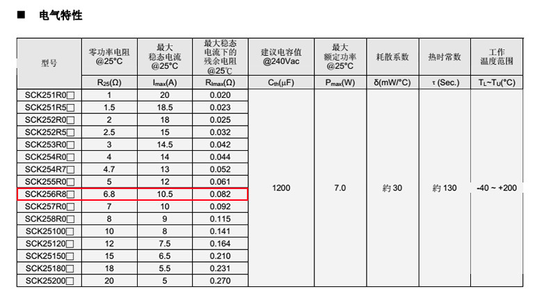 熱敏電阻: VT 熱敏電阻型號(hào): SCK256R8MSY 熱敏電阻片徑: Φ25mm 零功率電阻@25℃: 6.8Ω 工作溫度范圍: -40℃±200℃ 儲(chǔ)存溫度范圍: -40℃±85℃