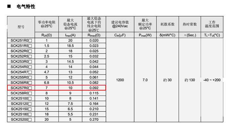 熱敏電阻: VT 熱敏電阻型號(hào): SCK257R0MSY 熱敏電阻片徑: Φ25mm 零功率電阻@25℃: 7Ω 工作溫度范圍: -40℃±200℃ 儲(chǔ)存溫度范圍: -40℃±85℃