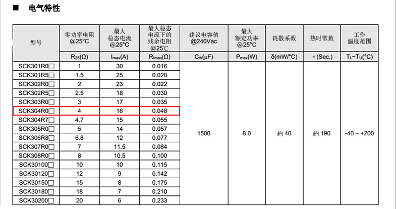 熱敏電阻: VT 熱敏電阻型號(hào): SCK304R0MSY 熱敏電阻片徑: Φ30mm 零功率電阻@25℃: 4Ω 工作溫度范圍: -40℃±200℃ 儲(chǔ)存溫度范圍: -40℃±85℃