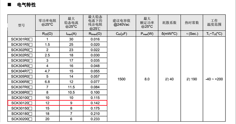 熱敏電阻: VT 熱敏電阻型號: SCK30120MSY 熱敏電阻片徑: Φ30mm 零功率電阻@25℃: 12Ω 工作溫度范圍: -40℃±200℃ 儲(chǔ)存溫度范圍: -40℃±85℃