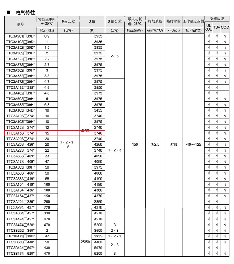 熱敏電阻型號(hào)::TTC3A153F374EY |