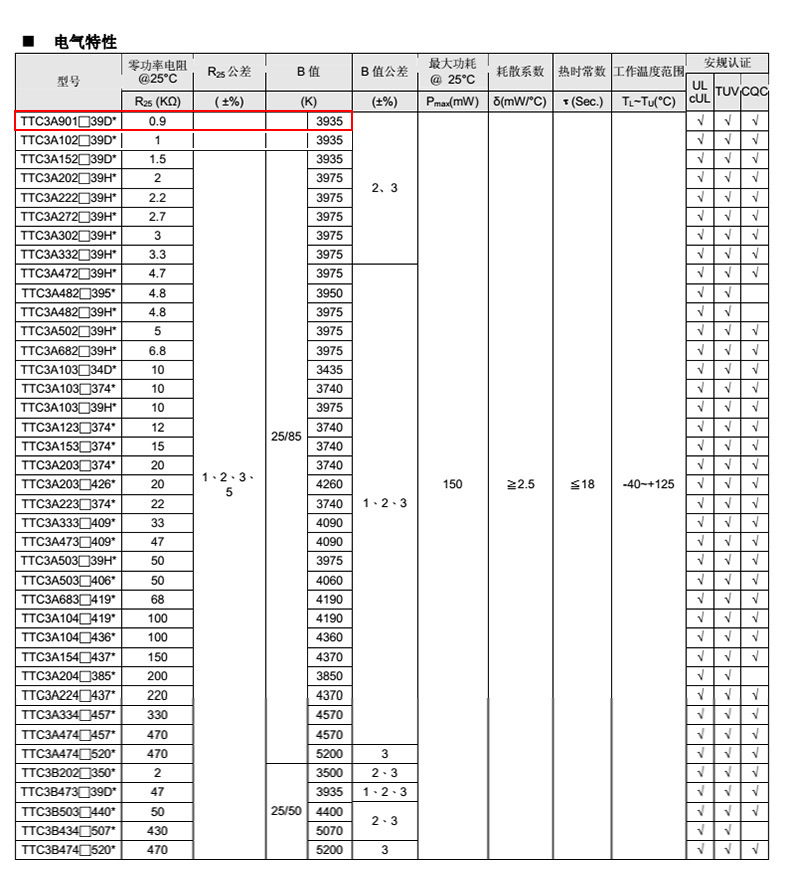 熱敏電阻型號(hào)::TTC3A901F39DEY |
